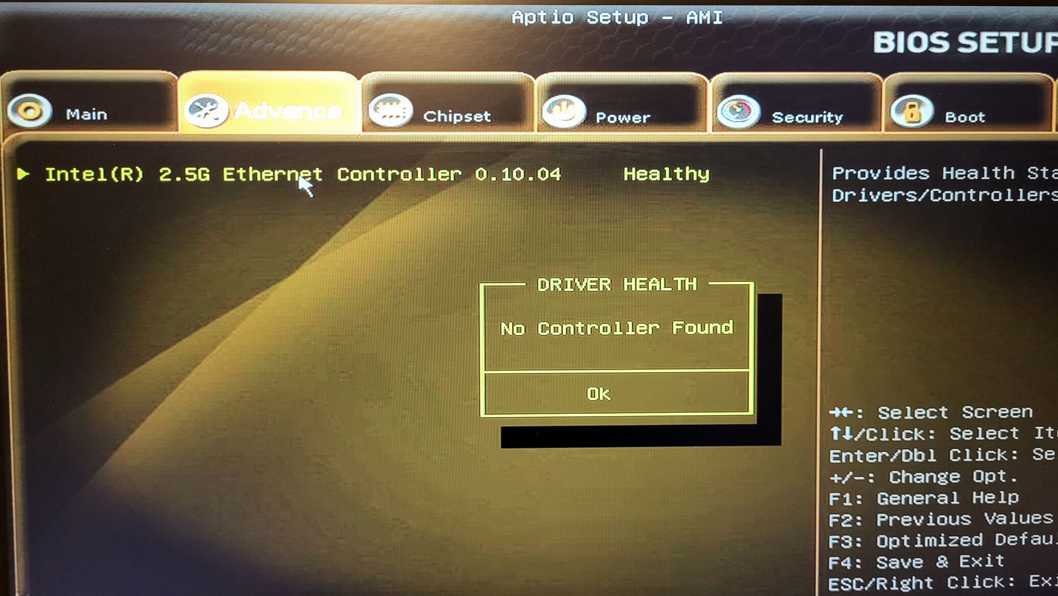 A BIOS-ban van egy "Driver Health" menüpont, amit nem nagyon tudok értelmezni: Itt listázza az ethernet controllert, mellé van írva, hogy "Healthy", de ha rákattintok, akkor "No Controller Found" üzenetet dob.