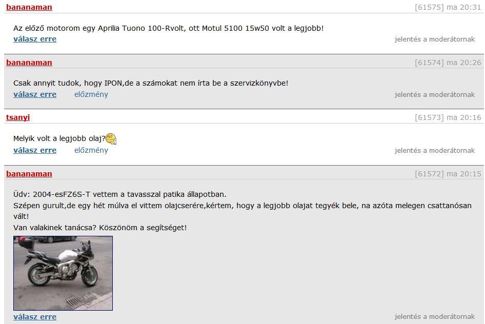 össze-vissza beszéltek, el kell menni meg kell nézni, kell váltani pár szót a tulajjal hogy kiderüljön miben hazudik, levonni a megfelelő következtetéseket, a javítandó dolgokat megpróbálni lealkudni és vagy megvenni a motort vagy nem megvenni..az nem tanács hogy "meg se nézd" meg hogy "hulladék" meg hogy "van olcsóbb" amikor nem láttátok élőben hogy mi az.. motort nem fórumon veszünk, főleg nem olyan fórumon ahol mindenki 10 éves, karcmentes, 10e km-t futott motort keres első gazdától szervizkönyvvel garanciával.. igények és kritika van de megy a fillérbaszás az olajon meg a kopó dolgokon..
