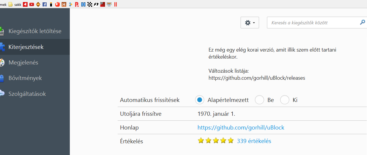 Feltettem valóban gyorsabb lett a mozilla, viszont a kiegészítőknél azht írja hogy 1970-ben frissült.... nekem ez kicsit szemet szúrt,,, ez nem baj nem gyanús? Amúgy láttam van chromera is meg operára stb,,, a vélemény nyílvánítóban is jókat írtak róla, gondolom rosz nem lehet, engem egyedül ez bosszant hogy azt írja 1970-ben frissült..