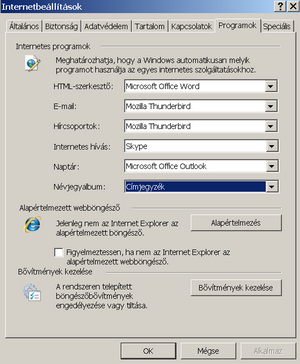 Vezérlőpult-->Internetbeállítások-->Programok-->Internetes Programok-->E-mail