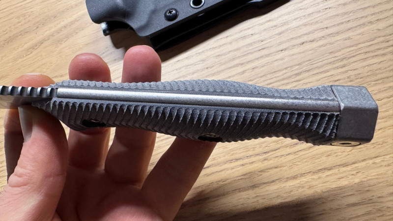 Kicsit rosszabbul tűrte ez az acél az élezésnél a lapos élszöget és kétszer is neki kellett mennem. Majd meglátjuk mennyire éltartó. Nincs keménység mérőm de elég kemény lett, alig vitte a csiszoló.A nyél maradék micarta, ugyanezt használtam a tanto késhez is, ez a másik fele