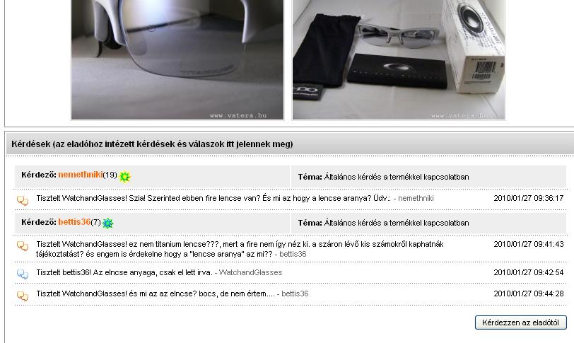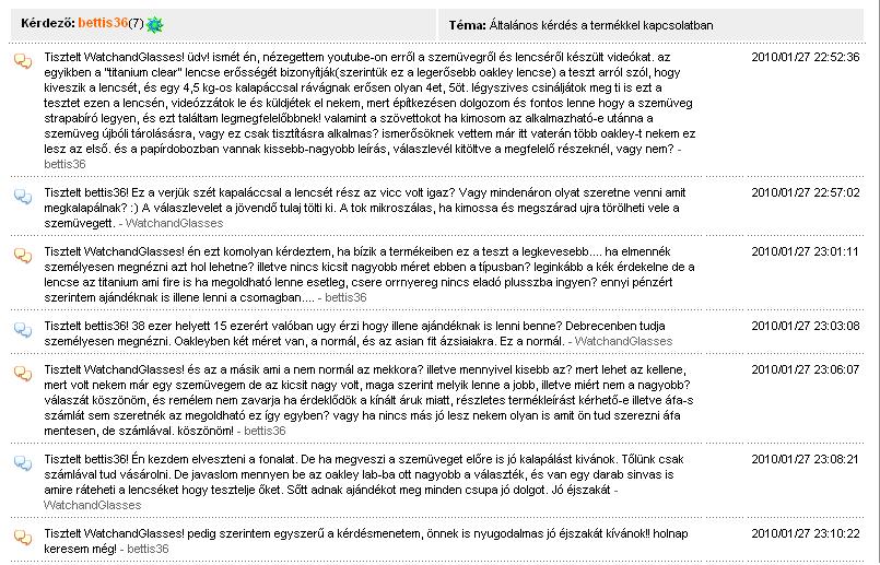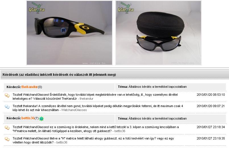 Tisztelt WatchandGlasses! Oké köszi. Ne haragudj de egész véletlenül láttam az üzeneteidet Spyderco-val. Nem tartom korrektnek hogy te fenyegetőzöl mert az az oilrig tuti nem frankó és ha értesz az Oakleyk-hoz ezt neked is tudnod kell. Szép napot. - nemethniki 2010/01/28 09:03:44
