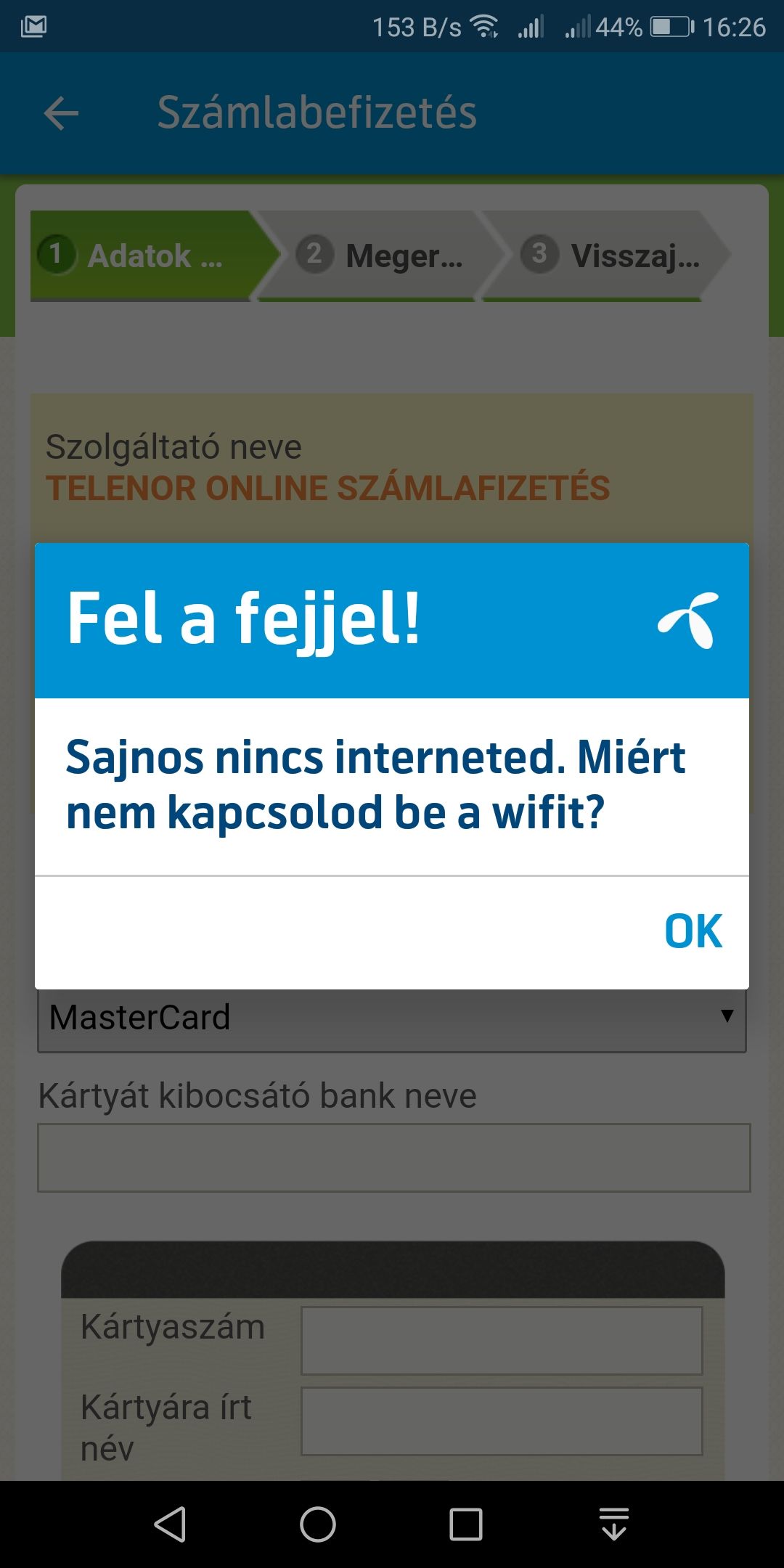 Beszeretném fizetni a számlát,erre ezt irja!