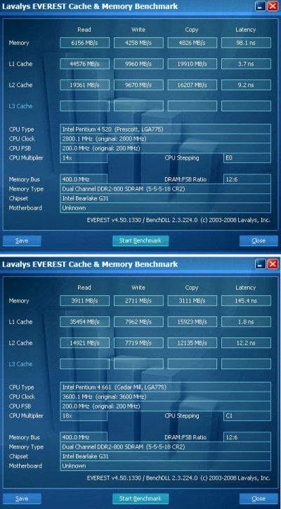 A problémám viszont az, hogy a 3,6 lassabb, mint a 2,8-as.Mindkét procit megnéztem egyforma, 200 MHz-es FSB-vel az Everestben és pl. a memória írásnál ilyen különbség volt