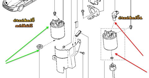 Lényegében így néz ki, ahogy a képen, nekem meg sikerült vennem a piros nyilast...mert f...sz voltam és nem figyeltem, de holnap már itt a zöld nyilas...Igazából a szétszerelés, kocsi megemel, jobb kerék le, pajzsot lebont etc van a tököm tele a cserével, az már nem is érdekel, hogy orrba-szájba gázolajas minden, mikor lehúzom a csatikat, de most kicseszek vele, vettem nagy fecskendőt és teli nyomom üzemanyaggal és adalékkal a szűrőt, hogy ne kelljen annyit pumpálni legalább. : D