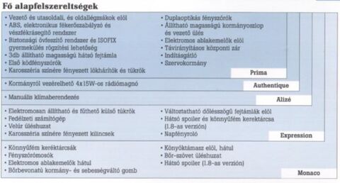 Apropó, még egy kérdés a Megane-os társadalomhoz. Van valahol valami elérhető összevetés, leírás hogy az 1-es Megane különböző felszereltségi szintjei milyen extrákat tartalmaznak?