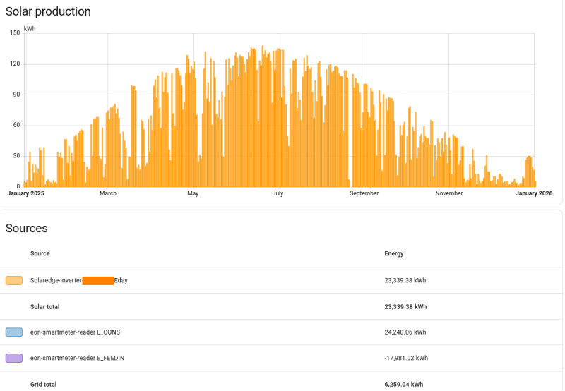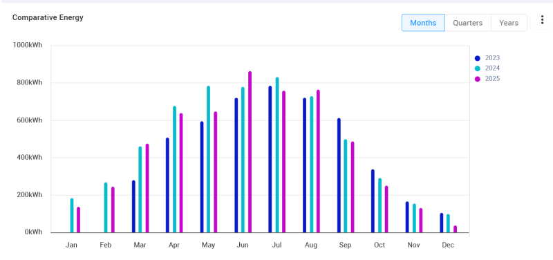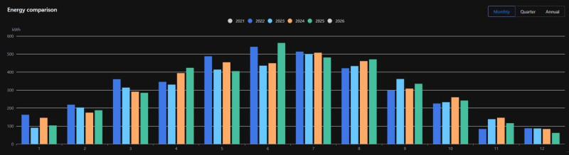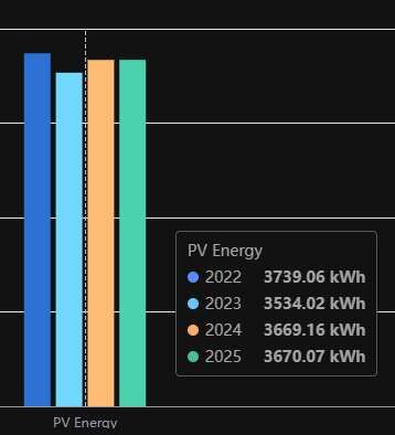 PVGIS kalkulátorral számolt átlag termelés 7,2MWh lenne, a 2025-ös tény 6,9MWh (Kalkulátor nem számol a reggeli ,kissé késleltetett [fa árnyéka] indulással. Illetve az őszi hónapok 80% körüli, és a december 56%-a okozta elsősorban a különbséget.)