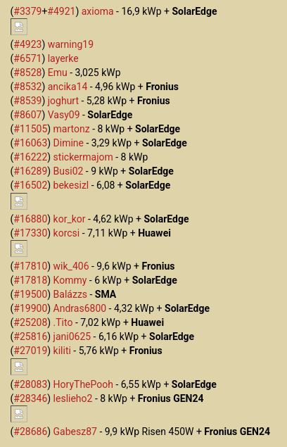 6,4 kWp, 4-s inverter, Zala. Ez a hónap eddig 56,8 kWh, tavaly 211 kWh, '23-ban 222,2, '22-ben a bővítés ( 2,3 kWp, dél 60°) előtt 63,5 kWh, '21-ben 88,2 kWh.