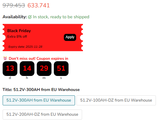 chungey9 írta, hogy BlackFriday vagy micsoda van, mert a 15 kWh-s akku kb. 210.000Ft. Gondolom ezt azért írta, mert azt látja a termék oldalon, hogy 633, bár se dollár, se euró nincs mögé írva, szóval ez is nagyon igényes... De bármelyik legyen a kettő közül, jó az ár, szóval jogos a kérdés, észrevétel.