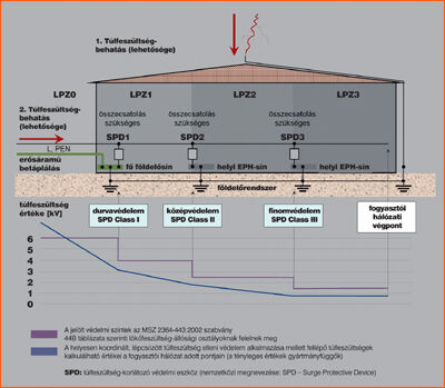 Akkor a T2 védelem megismétlendő az adott vezetéken ~10 méterenként.A készülékekbe illetve a készülékek, konnektorok elé nem sokkal egy-egy T3 védelem.