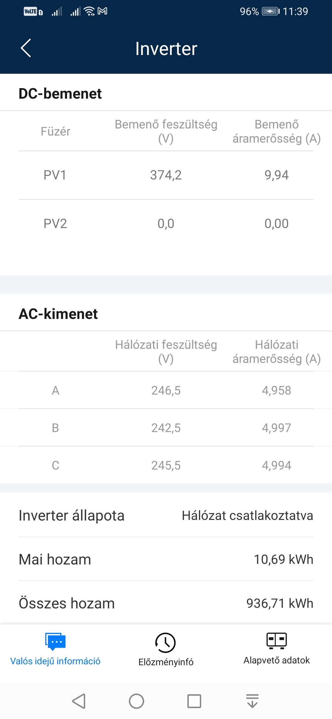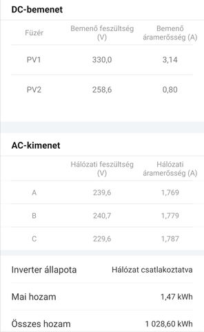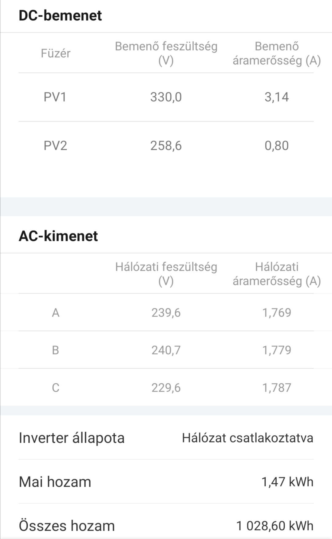 Az egyik probléma a méretezés. Az áramfogyasztásom egyrészt kicsi (5000 Ft/hó, 1500 kWh/év), másrészt nehezen saccolható (csak február óta vannak konzisztens adataim, de máig nem laktuk be véglegesen a házat, felújítás van ugyanis tervben). Az előző lakásban 6400 Ft/hó volt a számla, 2000 kWh/év. Elektromos autó nincs tervezve, hőszivattyú nincs tervezve (most lett gázkazán horribils pénzért); légkondi még lehet (itt a nyár, most derül ki), és ahogy a gyerekek iskolásak lesznek, egyre több kütyüjük lesz nyilván. Azt mondanám, hogy most egy 1,5 kWp-es rendszer elég lenne, a jövőre nézve pedig egy 3-4 kW-os inverter elég tartalékot képez. (A 3 fázis adott, az egységes tetőfelület első blikkre bőségesen elegendő.)