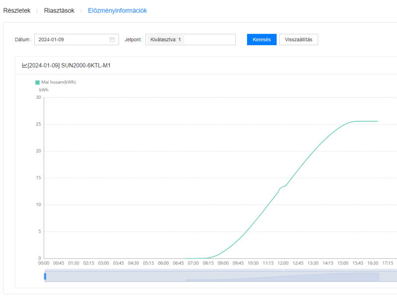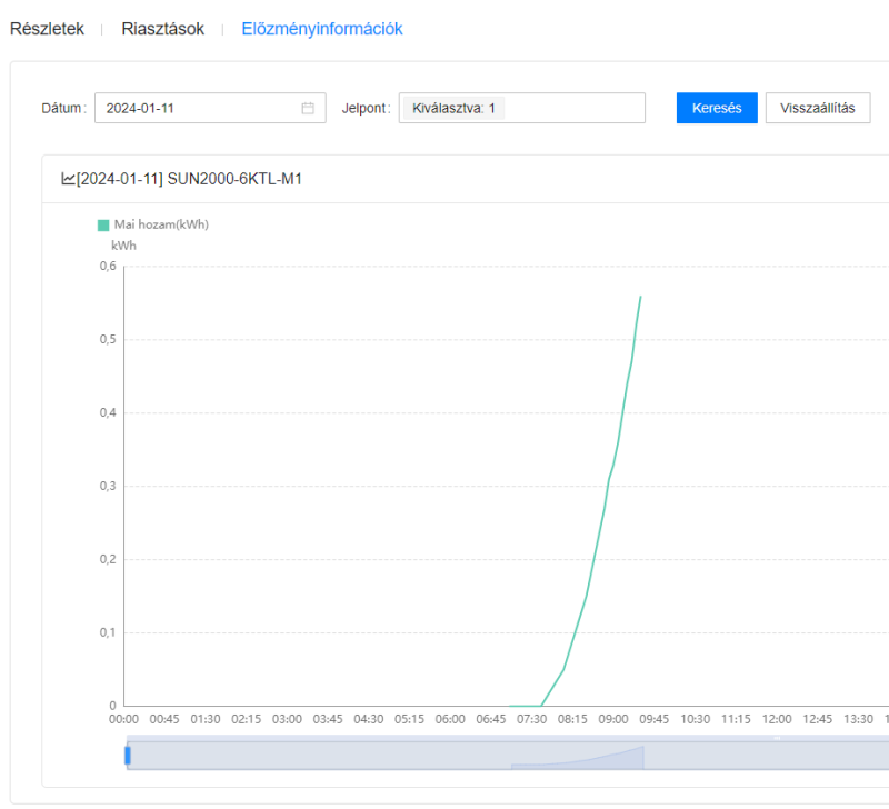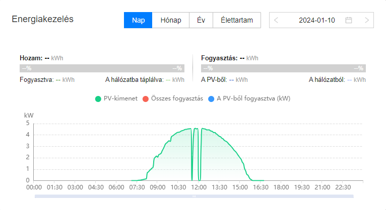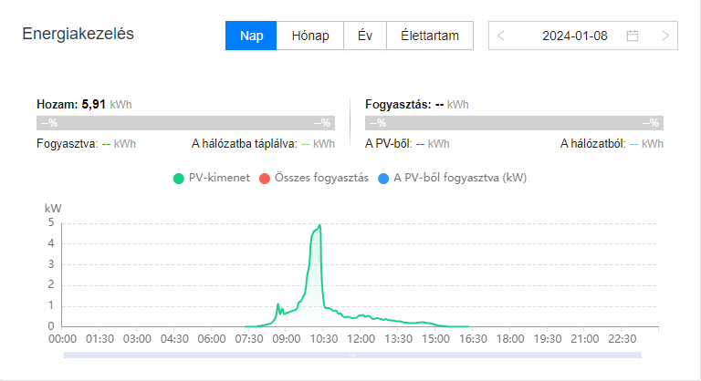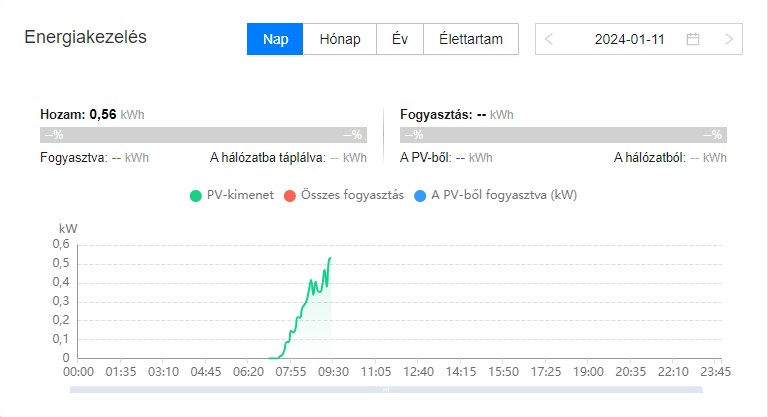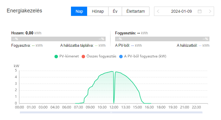 Látszik, hogy az inverter most is küldi az adatokat és meg is jelenik az eddig összegzett napi termelési adat is. Azonban ez így volt tegnap és tegnapelőtt is, de ennek ellenére éjfél után a fusionsolar "elfelejti" ezen napok termelési adatait összegezni és nem jelenik meg a napi, heti, havi, éves termelési adatok között.