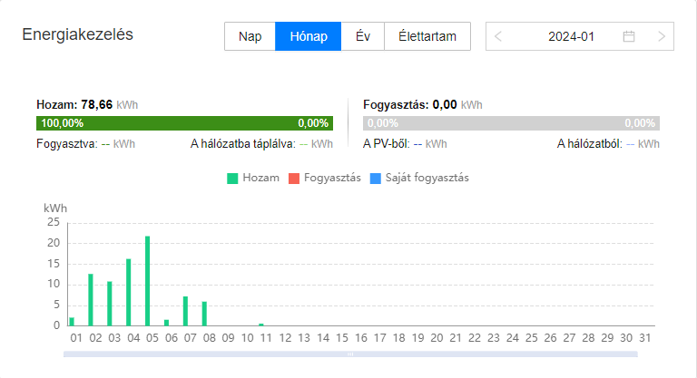 Most is mutatja az épp aktuális termelési adatokat és görbét a fusionsolar, de valami lesz a háttérben, mert január 8 az utolsó nap, amikor minden rendben lévőnek tűnik fusionsolar oldalon. Onnantól a napi termelési adatok nincsenek benne az összesített adatokban (de csak fusionsolarban, home assistant alatt megvannak)