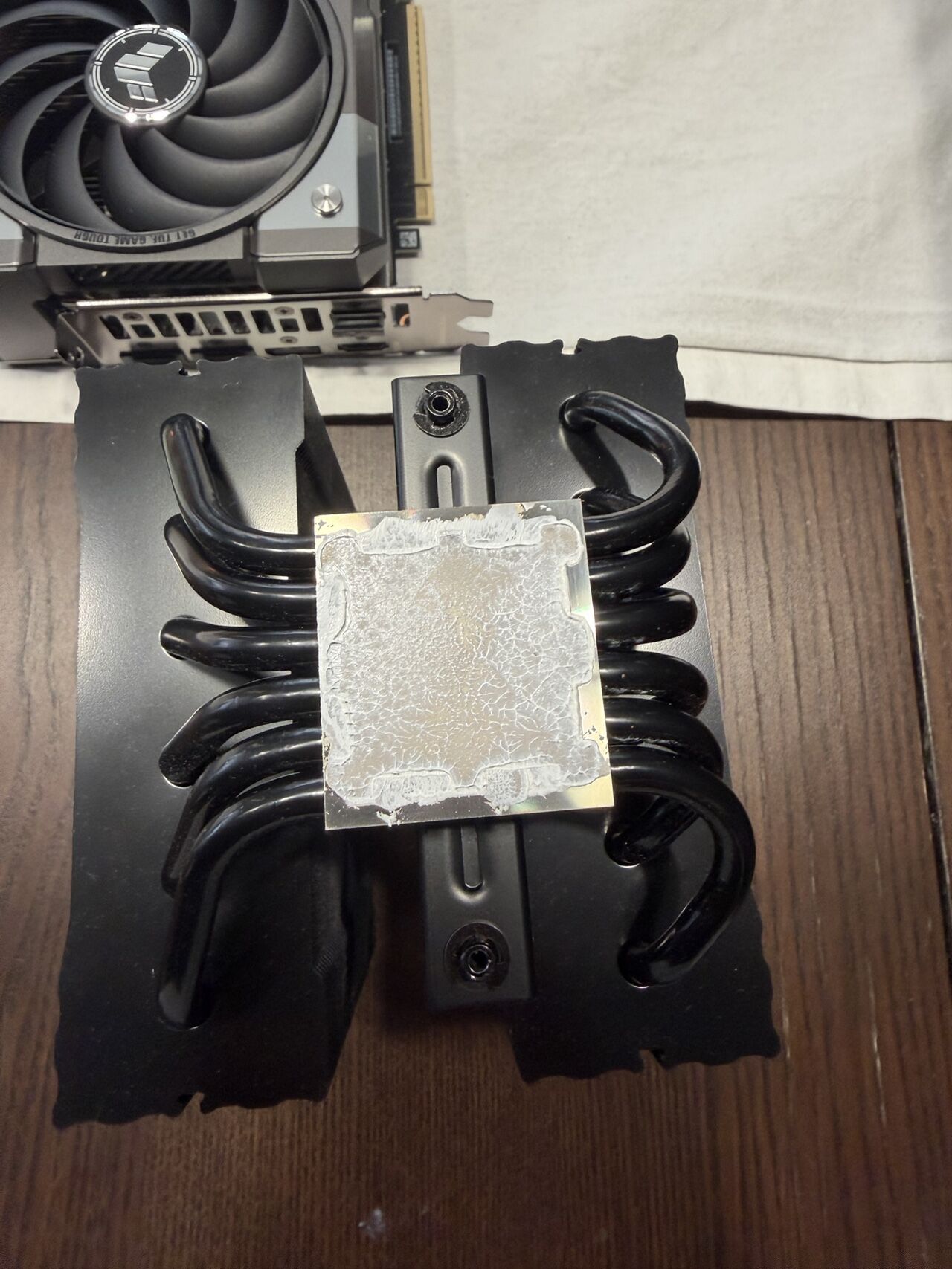 A holnap/holnapután kicsit megcsúszott, de most volt időm szétszedni a gépet. Mikor leszedtem a hűtőt, nem volt rajta fólia, és szerencsére a paszta is egyenletesen volt eloszolva, látszólag fedve a teljes a processzort (szóval a bracket is jól volt felrakva): [kép]