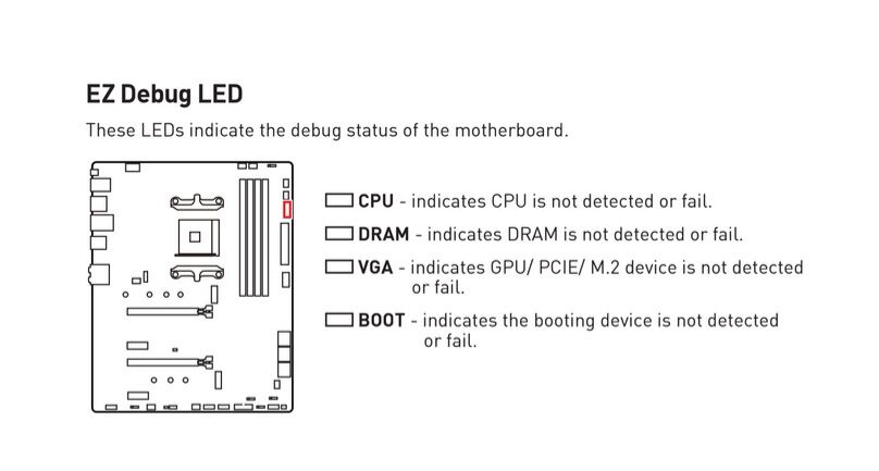 Az alaplapi CPU feliratú led felvillan majd úgy is marad, pár másodperc után pedig újraindul a számítógép majd ugyanez történik. Monitoron semmi, billentyűzet sincs, a power led sem világít a házon.