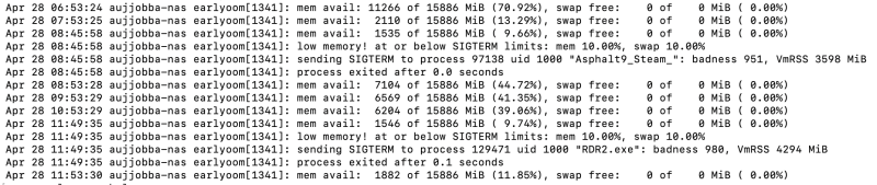 Az earlyoom tette a dolgat, az RDR2 tenyleg kifesziti a RAM-ot, ki is lotte egyszer a process-t az earlyoom.