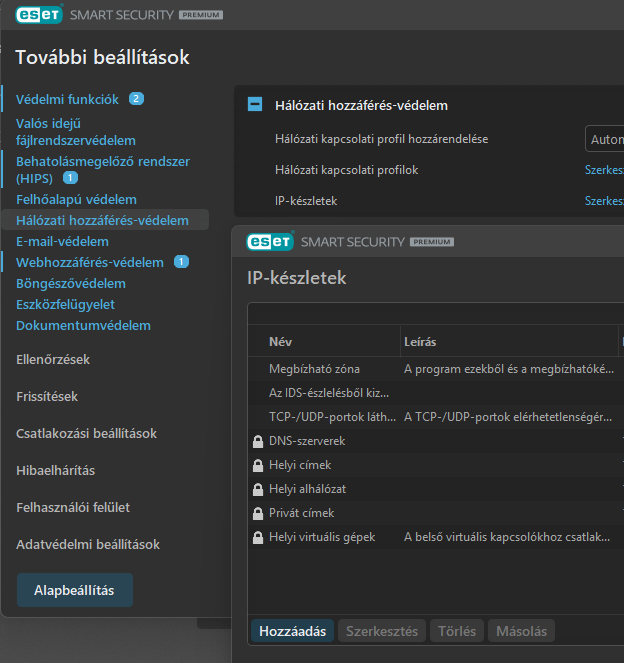 ESET Internet Security-ről lenne szó és a kérdésem a következő lenne: hozzá szeretnék adni ip címeket (a belső hálózatomról) a "Trusted Zone"-hoz, de sehol sem találom a beállításokban ezt a lehetőséget. Pedig régebben úgy emlékszem volt benne ilyen, hogy manuálisan hozzá lehetett adni. Így még ellenőrizni sem tudom, hogy az adott ip-t esetleg magától a Trusted Zone-ba sorolja e, vagy sem.