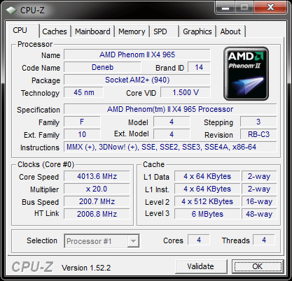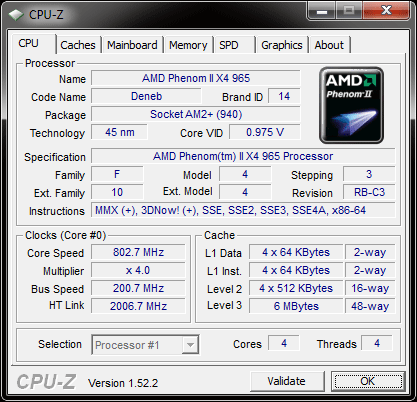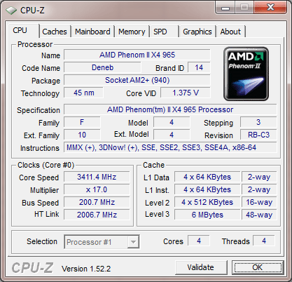 Just like its predecessor, the new Phenom II X4 965 BE runs at 3.4GHz, likewise, there are no changes in the cache architecture. Note, however, the new stepping (3) and the new revision code (RB-C3).