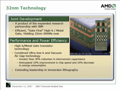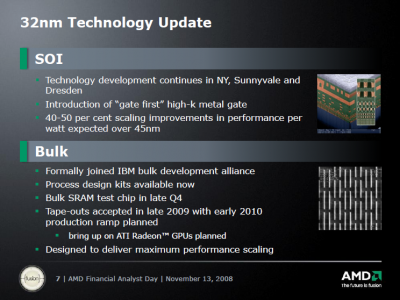 Secondly, there was a question about the amount of die space that is consumed by having 2 integer cores in a module versus just one. Bulldozer was designed to be a modular architecture where 2 integer cores are able to share certain resources where it makes sense (in order to reduce power consumption) yet still retain discrete components in order to ensure great performance and no bottlenecks. It was never designed as a single integer core in each module, so dissecting the module components becomes a bit more tricky. Some have compared this to SMT and made statements that SMT customers could see a modest increase in performance for only a fraction of die space. We believe that our Bulldozer architecture will provide far greater performance gains than SMT with up to 80% greater expected throughput when running 2 threads simultaneously compared to a single thread running on a single integer core. Our engineers estimate that the amount of discrete circuitry that is added to each Bulldozer module in order to allow for a second integer thread to run is ~12% at the core level, but because the integer cores are only a portion of the overall die space , the addition of the second integer core in each module only adds ~5% of circuitry to the total die. We believe this is an excellent balance of greater performance with a very small silicon cost.