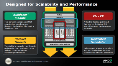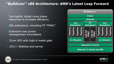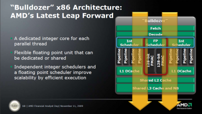 First, Bulldozer is based on a modular architecture where two integer cores are teamed up with an extra-large FPU to create what we call a Bulldozer module. Bulldozer modules are the basis of all of the designs that will be coming from this architecture, and it’s modular nature not only allows us to build processors with different sized core counts but also provides flexibility for future designs that could allow other modular components like GPUs to be added into the designs. The Bulldozer module is a concept and part of an architectural design, it is not something that the user will come in contact with. For instance, when an Interlagos system boots up, the hardware will see 16 integer cores, not 8 modules. When the OS loads, it will see 16 integer cores, not 8 modules, and the applications will see 16 cores as well. Because of this extremely consistent manner by which the whole system sees the integer core (and not modules), it is only natural that Interlagos will be marketed as a 16-core processor. It would actually be more confusing to call it an 8-core processor, because there is no point where a customer would see 8-cores.