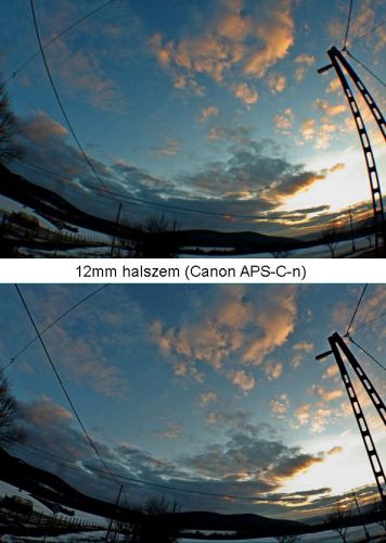 A két kép 12mm-es halszemmel készült. Az első az eredeti, a második egy "kivasalt" változat (ImageTrend Fisheye- Hemi-Plugin. - http://www.imagetrendsinc.com/products/prodpage_hemi.asp ) Ezzel lehet a legtermészetesebb módon kivenni a halszem torzítását és a legkevesebbet vág a képből (inkább csak a sarkait vágja meg kicsit).