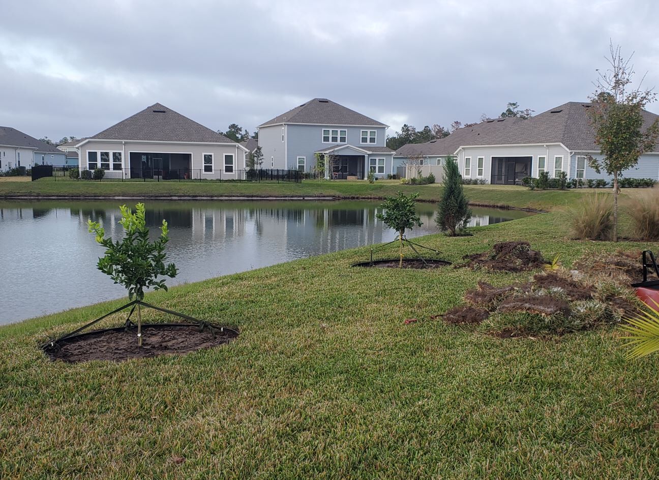 Eszak Floridaban van lombhullato meg orokzold is. A hazzal jott az amelyiknek nincs levele telen (juhar fa), mi meg ultettunk parat ami orokzold meg grapefruit es lime fakat. A jobb oldalon egyebkent szinten oshonos bokor van, azok mar nagyobbak. -