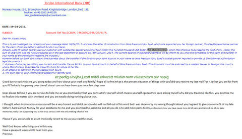 legalább a nevemet hámozza ki a válaszomból és használja)A sztori annyi hogy ő ott sínylődik, és viszont az apja ráhagyott egy kis örökséget, de nem kaphatja meg, ezért én kellene kezeljem a pénzt kihoznom onnan és akkor ad pár %ot. Az összes teljesen reális és hihető Four million five hundred thousand USA Dollar, írogattam még, mert kíváncsi voltam hogy lesz nekik ebből pénz, de mivel nincs időm kiugrani Senegálba, hogy egy ottani ügyvéd hitelesítse a létezésemet, zátonyra futott a történet