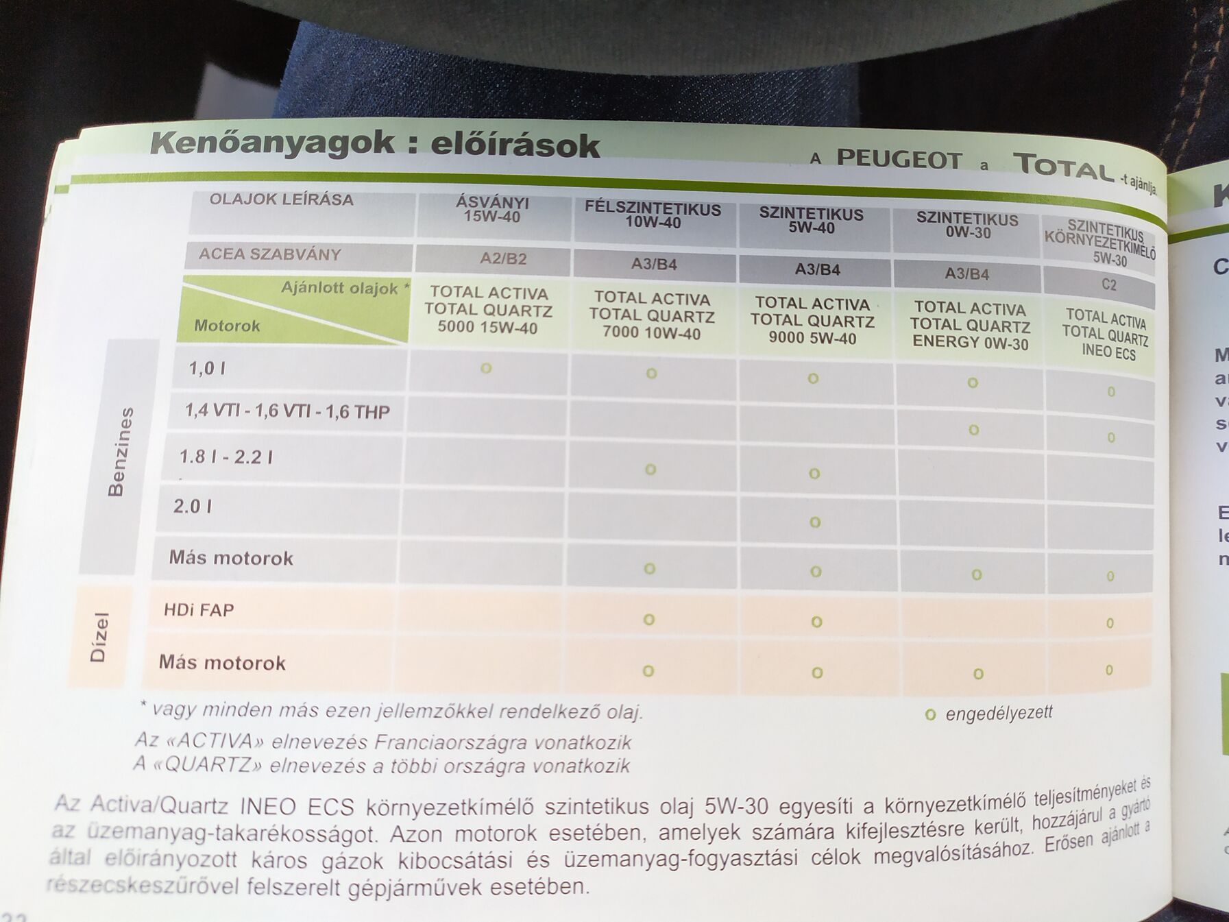 Akkor tehát a 2008.évjáratú Peugeot 1.4 VTI 1397cm3 70KW (8FS) motorhoz használható a Total Ineo First 0W-30 olaj. Eddig Total Ineo ECS 5W-30 kapott.