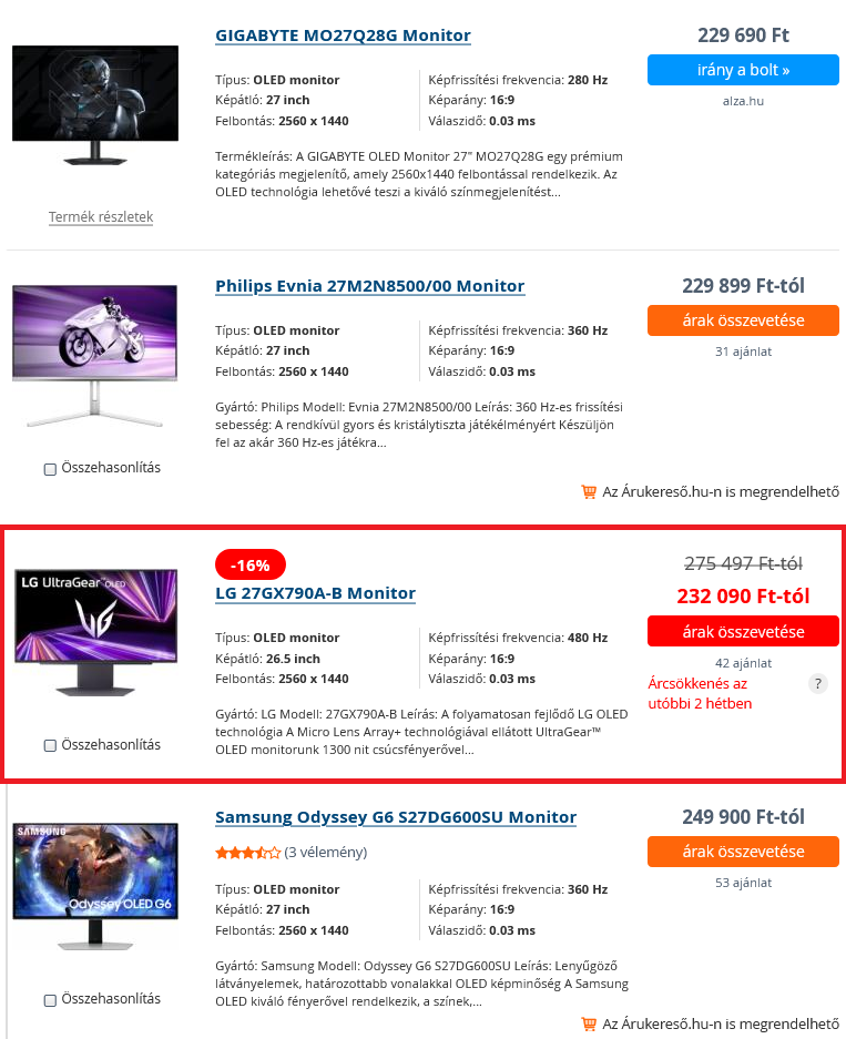 Szerintem megéri az LG 27GX790A-B azt a ~15% felárat, egy 240Hz 1440p Oledhez képest. Elég szoros egyébként a 27" 1440p 280Hz feletti mezőny, árban legalábbis.