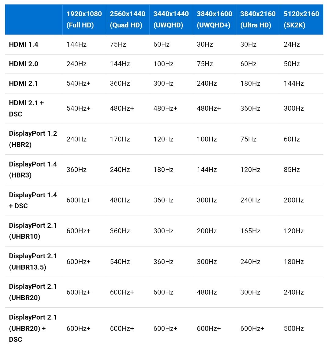 Kábeles kisokos felbontásonkénti maximum képfrissítési frekvenciával. Tehát 1080p, 1440p, 4k illetve Ultra Wide felbontásokon elérhető max Hz adott kábellel, szabvánnyal.