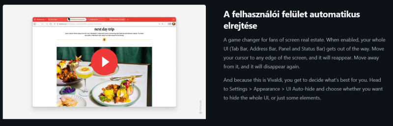 Igazi oledbarát böngésző lett mostmár. Ha jól tudom ezt még semelyik böngésző nem tudja a Vivaldin kívül. Gyakorlatilag a teljes felső részt, menüvel, tab-barral, lapfülekkel elrejti, és csak akkor csúsztatja be ha fentre viszed az egeret.
