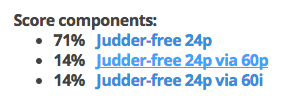 "judder- free 24p via 60p/i" tipikusan tv adásoknál kell, amikor a 24ps anyagot 60pben adják le, a tévé visszaszámolja 24pre. S az elég kadenciahelyes tud lenni, lévén a 3:2 pulldown elég egyszerű matek visszafelé is