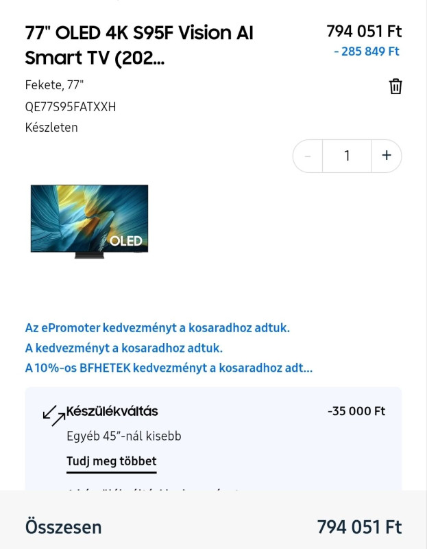 Legjobb ár 1.149.990 volt Alzánál. 0% thm 20 hónapra.... ááá, mondom, egyszer élünk! legyen. Van még + termék is ingyen, amit külön lehet igényelni mellé (Soundbar, óra, vagy mosógép).Ma reggel azért a samsung weboldalát is megsasoltam újra. Kuponokkal 1.1m alá ment... hm. Megnéztem a levelezésemet, hogy nem regeltem-e Samu BF-re? Amit helyette találtam az sokkal jobb volt. Végre VIP lettem, multistore megnyit, BFEXTRA kód beír (mást amúgy nem fogadott el (WARRIOR10, vagy a többi ismert és CRP-t sem)). Bement 1m alá!