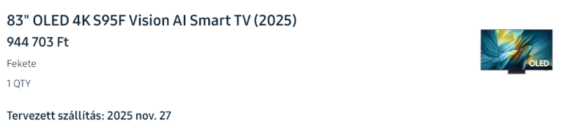 Chaten azért egy KMZ-re rápróbáltam. Kaptam, beírtam, azzal ment kombinálva lett 944.7k (LG G5 77" kb ennyi a Medianál, így végül 83"-ost vettem a 77" helyett. 65" QLED-em volt, szóval a 83 nagyobb és látványosabb ugrás lesz).A lényeg az alábbi screenshot (27-re kértem a kiszállítást).