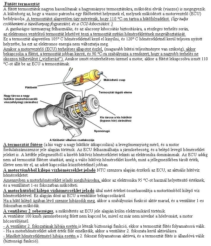 "…A kiszerelt termosztát ellenőrzésénél a termosztátot fogóval megfogva peremig behelyezzük egy kb. 50 °C-os hűtőfolyadékkal töltött edénybe. A villamos csatlakozóba bekötött segédvezetékeken keresztül akkumulátorfeszültséget kapcsolunk a fűtőbetétre, majd 10 perc elteltével ellenőrizzük, hogy a nagy szeleptányér minimálisan 7 mm-t emelkedett-e az alaphelyzetéhez képest. Ezt az ellenőrzést szabadlevegőn nem tanácsos elvégezni, mivel így a tágulóelem károsodhat! …"