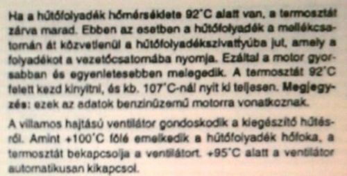 Az utolsó mondatot pontosítanám:nem a termosztát kapcsolja a hűtőventilátort, hanem a ventilátor kapcsoló.Ha zavar a „magas” vízhőfok,olyan ventilátor kapcsolót kell beletenni, ami hamarabb kapcsolja be a hűtőventilátort. (Normál esetben 105 C foknál kapcsol be,95-nél ki) de van olyan,amelyik 88/83-kapcsolású.