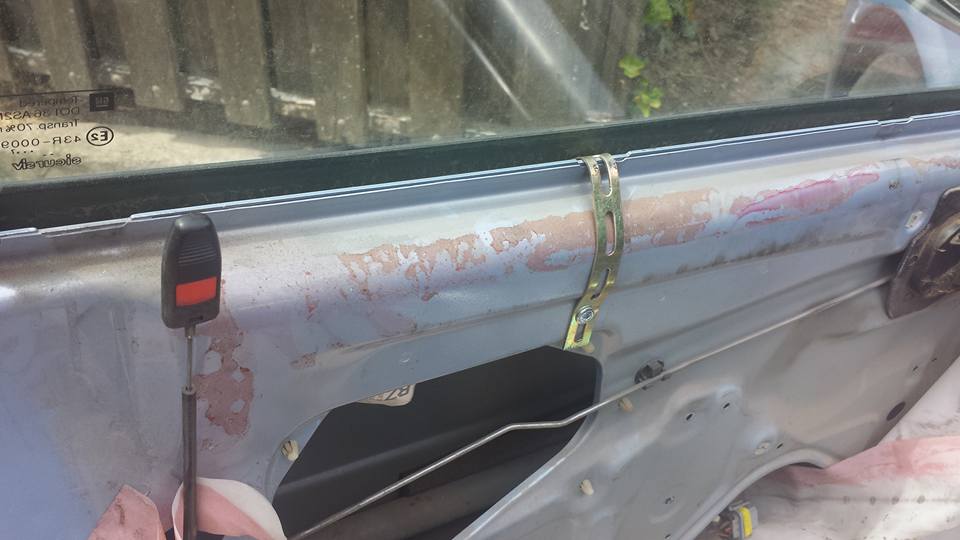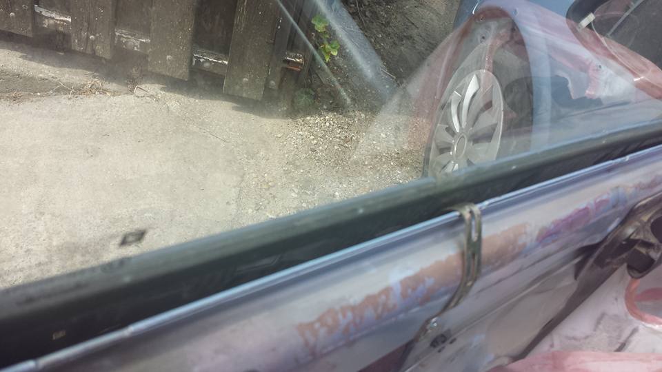 Ha ez megvan, a bal oldalon lévő függőleges horony mögött már látni lehet a menetes rögzítési pontot. Ha nem, akkor picit meg kell billenteni balra felfele az üveget. Közben be lehet csúsztatni a vezető sínekbe az ablaküveget. (én ezt nem csináltam, mert nem vettem észre, és a jobb oldalon nem csúszott bele)