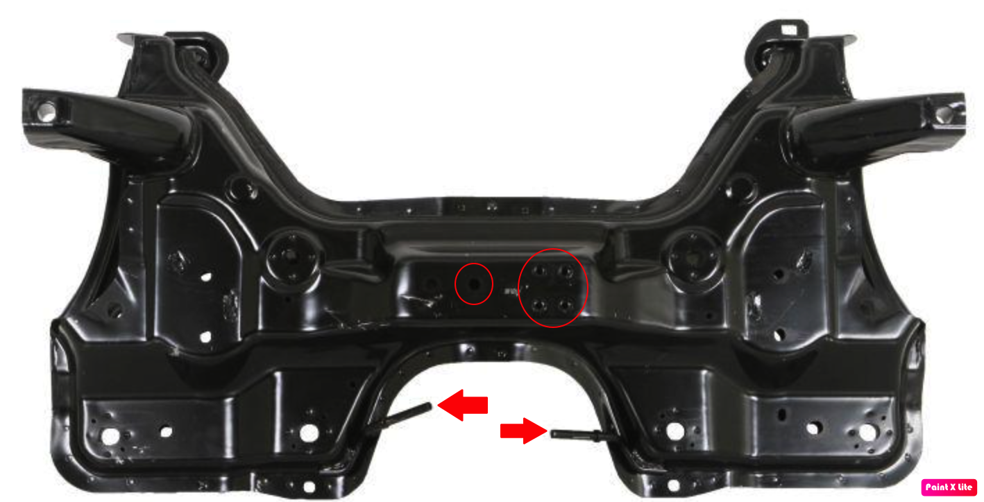 Végül egy olaszországi 1.3CDTI bölcsőt sikerült szerezni. Azon a kipufogó felfogatását a két, nyíllal jelölt vasdarabbal oldották meg, ami pl más motoroknál nincs odahegesztve.