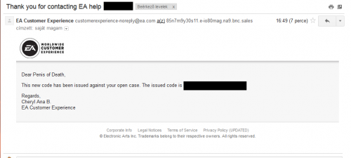 Az EA ügyfélszolgálatnak mennyi ideig tart beaktiválni egy játékot? Két napja beszéltem velük, hogy legyenek szívesek aktiválni a dobozos Crysisomat Originen. Tíz perc múlva jött is a levél, amiben kérték a fényképet. Válaszoltam rá rögtön, azóta semmi...