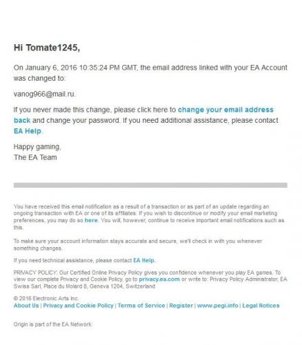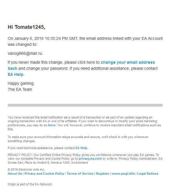Az EA-fiókodhoz társított e-mail cím 2016. január 27. 2:26:09 GMT 00:00 időpontban a következőre változott: