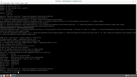 A következő lépés: ln -s mi-r3g.config .config , ellenőrizzük jó e a link: ls -l .config . Ha ez megvan szerkesszük a konfigurációt ízlésünk szerint, tetszőleges editorral pl mcedit, vagy ha van grafikus felület akkor pl gvim(kell némi vi alapismeret a kezeléséhez). Ha megvagyunk a konfigurálással akkor kiadhatjuk a ./build_firmware.sh "parancsot" (ez egy script