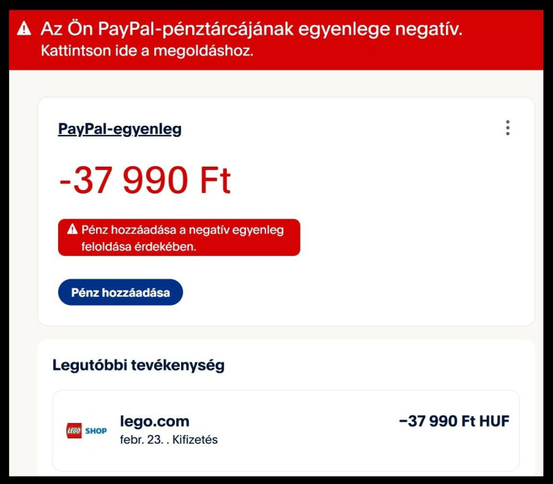 A PayPal pénztárcámon negatív egyenleg keletkezett, valamint alatta ott egy befejezett, kifizetésre került tranzakció a LEGO részére, miszerint 37.900 Forintot elutaltak nekik.Most akkor mégis elküldték a LEGO-nak a pénzt, és azt terhelték rá a pénztárcámra, ezért van most tartozásom? Ez lenne a logikus következtetés, csak azért furcsállom, mivel 0 Forint volt rajta, így elvileg akkor most ez egyfajta hitel volt? Ilyet is lehet a PayPal-lal? Nem értem, pontosan mi történt, ezért kérdezlek meg titeket, hátha el tudjátok magyarázni...