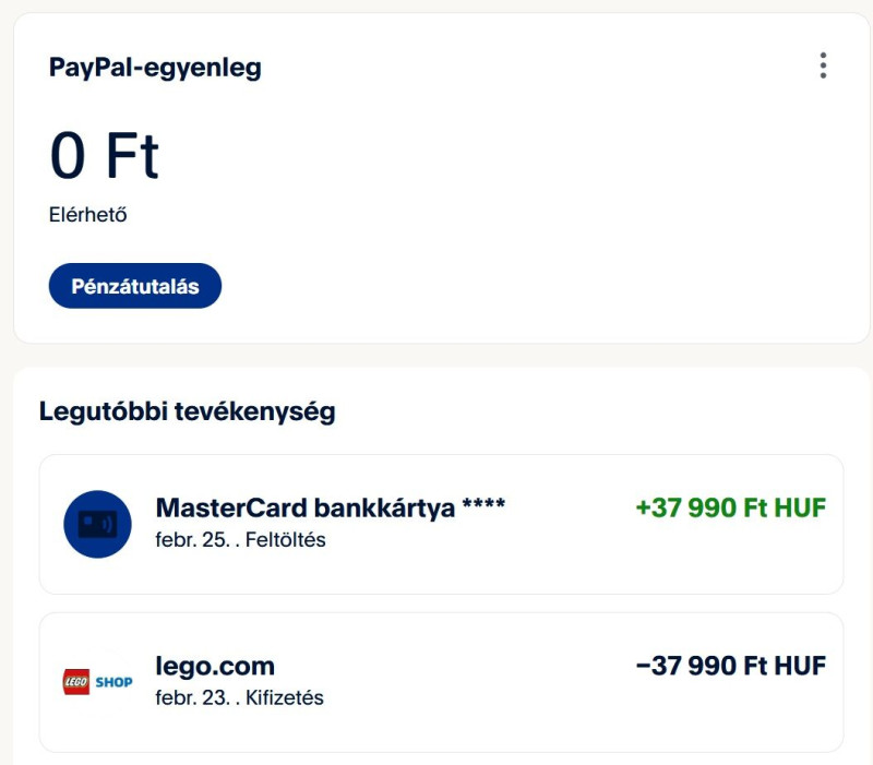 Ma délelőtt a bank feloldotta az összeget a számlámon, azaz tulajdonképpen visszakaptam a pénzt. Szóval én most elvileg ezt rá tudnám tenni a PayPal pénztárcámra, hogy ne legyek mínuszban, viszont a LEGO még nem erősítette meg, hogy ők ezt a pénzt valóban megkapták.