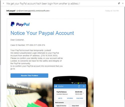De az e-mail feladója szerintem nem a Paypal, adathalászkodik valaki. Paypal nem Microsoft szerverről írogat.