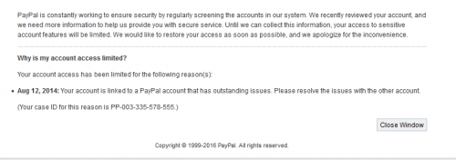 PayPal is constantly working to ensure security by regularly screening the accounts in our system. We recently reviewed your account, and we need more information to help us provide you with secure service. Until we can collect this information, your access to sensitive account features will be limited. We would like to restore your access as soon as possible, and we apologize for the inconvenience.