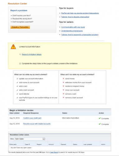 To help us with this and to find out what you can and can't do with your account until the issue is resolved, go to the Resolution Center.