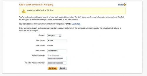 Kérdés: Szeretném a ……..Bank számlaszámomat felrögzíteni a Paypal fiókom alá, de nem sikerül.