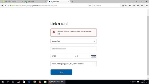 Pénz van rajta? Mert amikor beírod a számot megy az 1 dolláros ellenőrző terhelés hogy jó-e a kártyaszám ez legalább 300 Ft fedezet és 1 vásárlási limit, ez nem sikerült. Vagy nem aktív a kárta, vagy fedezet hiány vagy számítógépről kellene indítani.