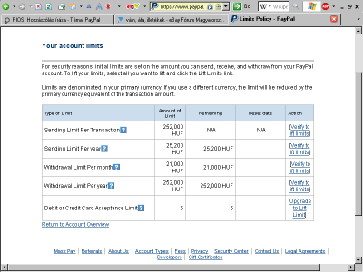 Elvileg a PayPal My Account oldalán a View Limits linkre kattintva láthatod, hogy milyen limitek vannak. Közülük (ha több van) kiválasztod azt, amelyik esetében elérted határt és a Lift Limits gombra kattintva láthatod, hogy mit lehet tenni.