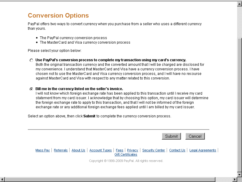 Pl. ha dollárban kell fizetni és az első opció aktív, akkor először a paypal konvertál forintra, aztán ezt a terhelést küldi a banknak és a forintot a dollár devizavételi árfolyamán terheli be. Nehogy már neked több dollárod maradjon a számlán.